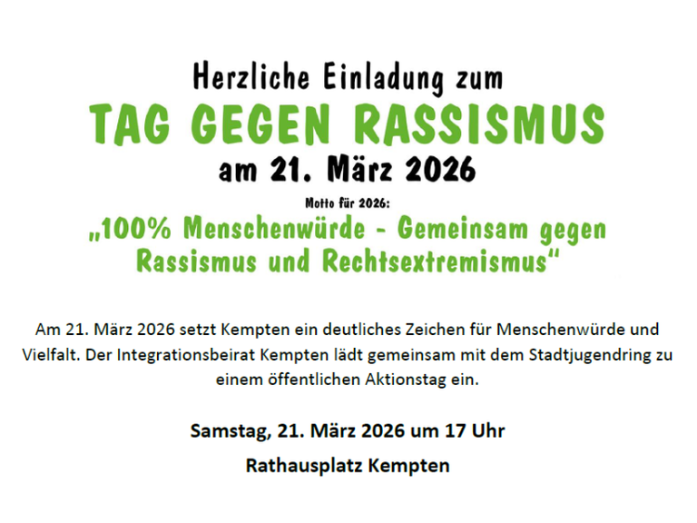 Am 21. März 2026 setzt Kempten ein deutliches Zeichen für Menschenwürde und Vielfalt. Der Integrationsbeirat Kempten lädt gemeinsam mit dem Stadtjugendring zu einem öffentlichen Aktionstag ein.