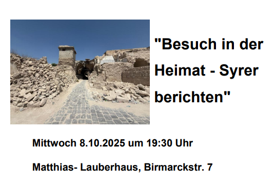 Zwei inzwischen eingebürgerte Syrer haben nach über 10 Jahren ihre Familienangehörigen in ihrer Heimat besucht und berichten aus ihrer Sicht von der Situation in Syrien und auch zur Lage der Syrer in Jordanien und der Türkei.